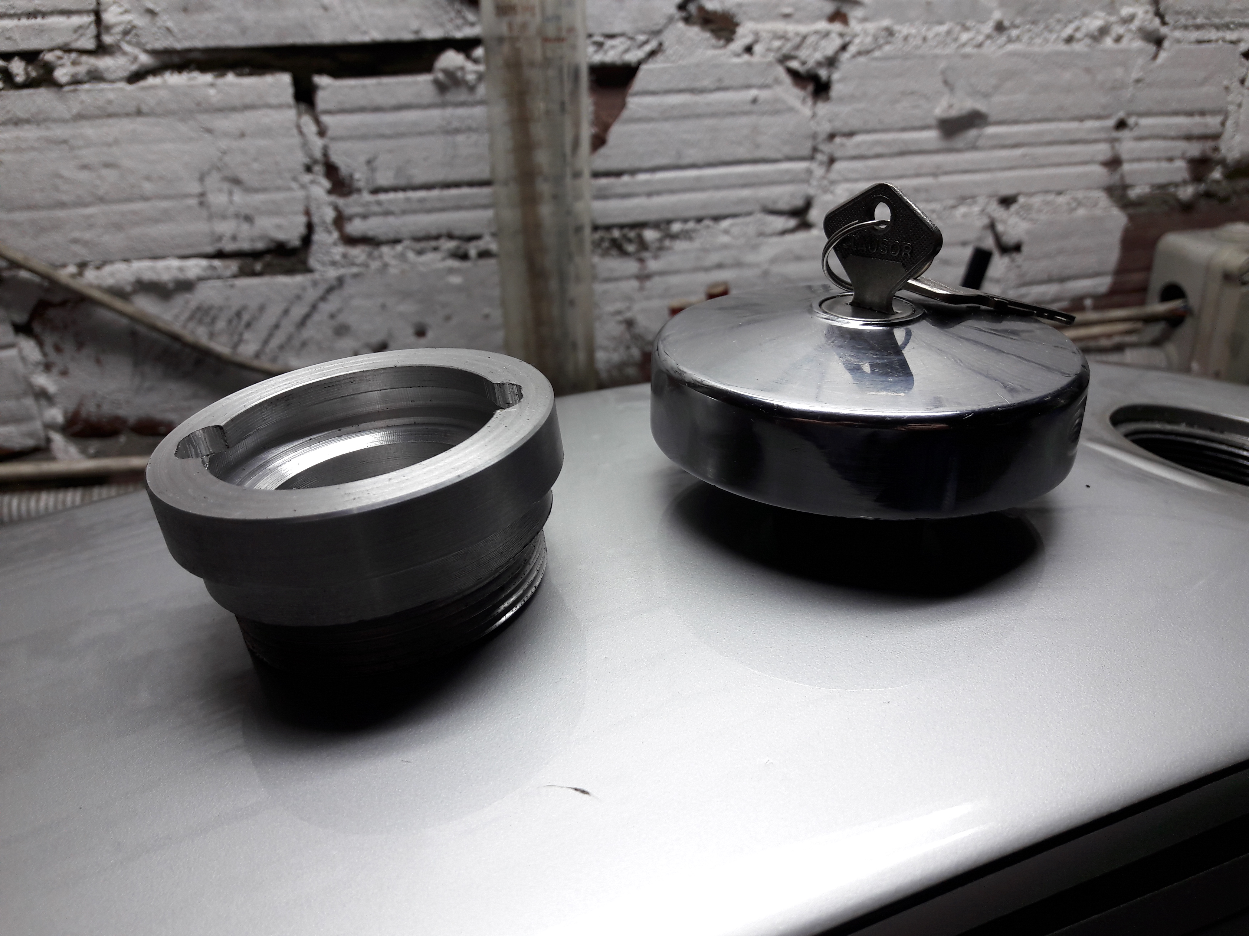 Pues ésta es la solución más sencilla. Nosotros fabricamos este casquillo que se rosca en el depósito y se "ancla" por medio de 3 pequeños allen. Está fabricado para usar un tapón con llave de la marca "clausor" que se puede conseguir en cualquier recambista de automóvil clásico.